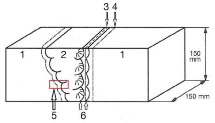 图3 用于微观组织、显微硬度分布和裂纹尖端张开位移(CTOD)测试研究的ABS EH36钢焊接接头示意图:1 -母材;2 -焊缝;3 - CTOD刻痕线;4 - HAZ的范围;5 -显微硬度和显微组织评估的位置;6 –晶粒粗化热影响区(GCHAZ)的边界。