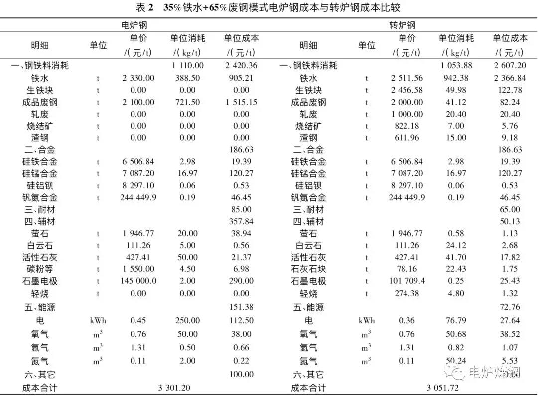 由表 3 可以看出,50%铁水+50%废钢流程电炉 钢成本较转炉钢成本高 224.82 元 / t。