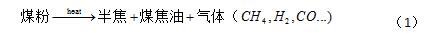 第一阶段当煤粉由管道被喷入直吹管道后,在热空气中自发热解,紧接着挥发分与热风混合后发生均相着火,从而产生一系列的物理化学反应,例如半焦的生成和膨胀、煤中焦油的析出等,其转化过程可以表示为: