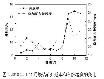 高炉2014年投产至今已经将近五年,原燃料质量问题随着市场变化,目前通过原燃料管理,已经能够保证原燃料各项理化性能的分析数据真实、及时、准确的传送给高炉,高炉对外围原燃料变化能够及时调节应对,将原燃料物理性能和化学成分的变化对高炉炉况的影响降到最低。高炉烧结矿筛分的主要任务是将<5㎜的粉末筛除,减少入炉粉末量,提高料柱的透气性能,我炼铁厂传统的筛分模式是通过料仓下料口大小控制烧结矿下料量,这种模式的弊端是随着烧结矿的用量增加,槽下给料机不能满足备料的时间要求,振时一般只能控制在50kg/s,振筛难以满足筛分任务;针对这种现象,高炉作业区专门组织专项攻关,工艺与设备相结合,制定专门方案,于9月份实施,通过调整烧结矿给料机电机的震动幅度,由之前的50%为基础调整,通过实践研究得出震动幅度在30%时,烧结矿的振时由50kg/s降为35kg/s,满足备料需求,还解决了振料时由于烧结矿个别粒度大而卡下料口的情况,图2为调整前后返矿率和烧结矿入炉粒度的变化: