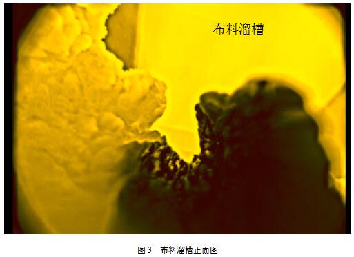 5月中旬开始对高炉装料及布料设备进行了排查,重点包括气密箱和布料溜槽。2019年1月3日检修时发现气密箱中心喉管碰撞点耐磨合金磨损4处,每处面积100×100mm,当时进行了补焊处理,中心喉管磨漏有一定几率造成布料偏析,可通过倒罐和倒转操作减少布料偏析,降低中心喉管漏对布料的影响。对气密箱经过排查后,没有发现设定布料角度偏离的问题。最后将排查重点落在布料溜槽,布料溜槽悬挂于气密箱下部,位于料面以上正中位置。虽然4#高炉有炉顶摄像,可以观察到布料溜槽动作,但通过炉顶摄像只能看到溜槽的下半部分,对于上半部分包括炉料落点位置都是看不到的(见图3),无法看到溜槽侧面布料时的情况,且溜槽布料时侧向位置的料流情况也是无法看到的,如果需要彻查就只能停风检修时打开炉顶人孔确认。2019年1月3日检修时发现布料溜槽落料点耐磨合金磨损,共计两处磨损严重,每处磨损面积100×150mm。因此有理由推断布料溜槽磨损处加剧,且有可能导致衬板移位,布料时发生偏差。