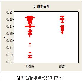 1)含碳量在0.08%-0.17%的包晶钢由于线收缩较大,坯壳与结晶器器壁容易形成气隙,气隙的过早形成会导致坯壳厚度不均,在薄弱处形成裂纹。对我公司150*150包晶钢表面酸洗样品与钢中含碳量进行对照分析:含碳量在0.15%以下,未发现过表面裂纹缺陷;表面裂纹主要发生在含碳量在0.16%-0.19%的炉次。如:图3、表1