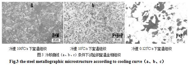 根据图2分析,试验钢室温下的金相组织可能为贝氏体+马氏体、铁素体+珠光体+贝氏体、铁素体+珠光体,冷却曲线(a、b、c)条件下试验钢室温金相组织见图3。