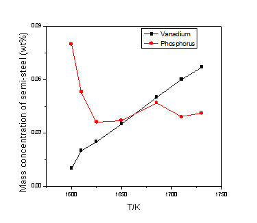 Fig.2 Relationship between reaction temperature and V, P compositions in semi-steel