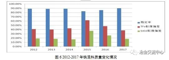 通过一系列技术措施和自动化程序的完善,直供铁混料的产量(表1)和质量(图4)得到了保障和提升。2016年底由于限产四号高炉停炉至今,因此2017年铁混料产量降低。