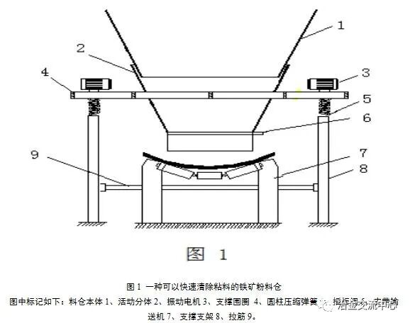 为了解决小混料易粘仓问题,作业区发明了一种可以快速清除粘料的铁矿粉料仓,料仓由料仓本体和下部活动料仓两部分组成,下部活动料仓与料仓本体的下部为活动对接,下部活动料仓包括活动分体、支撑围圈、振动电机、支撑支架,支撑围圈为圆环形,活动分体坐落在支撑围圈的内孔中,支撑支架为四根直立的直杆,支撑支架支撑在支撑围圈圆周平面的下方,振动电机安装在活动分体外侧的支撑围圈上。