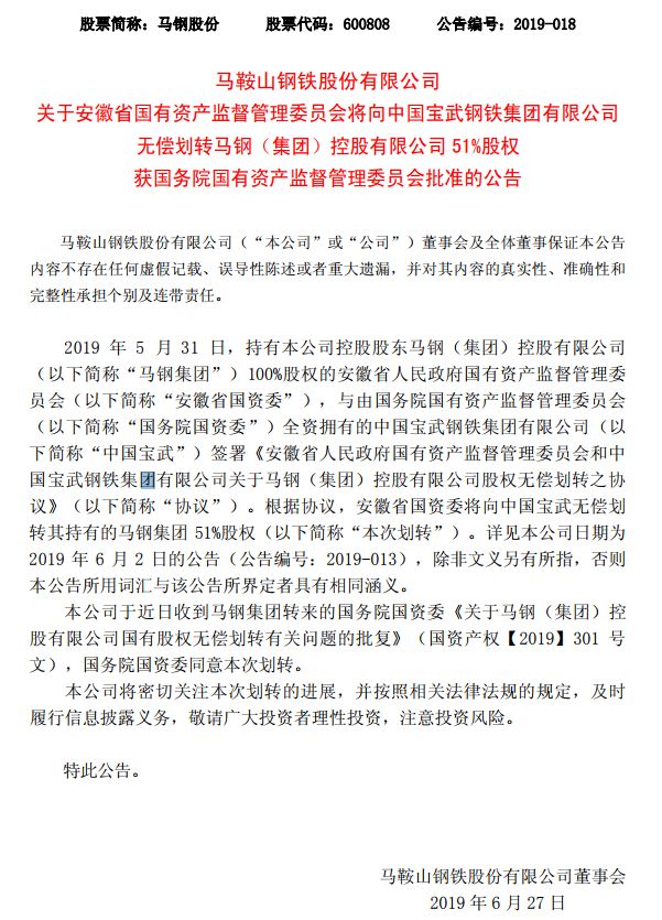 《公告》表示,马鞍山钢铁股份有限公司于近日收到马钢集团转来的国务院国资委《关于马钢(集团)控股有限公司国有股权无偿划转有关问题的批复》(国资产权【2019】301 号文),国务院国资委同意本次划转。