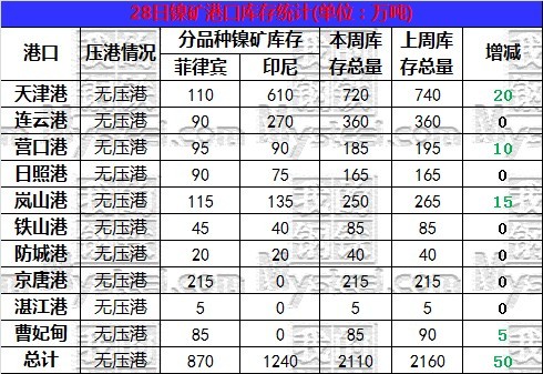 库存方面:28日镍矿库存约为2110万吨,环比上周减少50万吨。天津港720万吨减20万吨,连云港360万吨平,日照港165万吨平,岚山港250万吨减15万吨,京唐港215万吨平,营口港185万吨减10万吨,曹妃甸85万吨减5万吨。