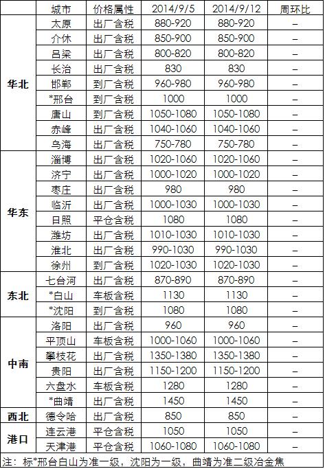 本周各地市场价格:山西地区本周整体持稳,现主流二级冶金焦出厂含税价850-880元/吨;主流准一级冶金焦出厂含税价900-950元/吨;河北焦炭市场平稳,现二级冶金焦邯郸960元/吨,唐山1050-1080元/吨,均为到厂含税价;邢台地区准一级冶金焦邯邢到厂价1000元/吨,唐山准一级到厂价1100-1130元/吨;河南焦炭市场持稳,二级冶金焦出厂车板价980-1000元/吨;准一级冶金焦车板含税价1030-1050元/吨;华东地区平稳,二级冶金焦主流960-1030元/吨,准一级1080-1100元/吨,均为出厂含税价;东北地区平稳,现二级冶金焦主流出厂1090元/吨,准一级冶金焦到厂含税1150元/吨。