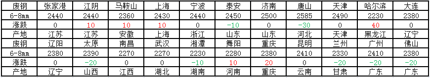 浙江废钢:本周浙江废钢稳中盘整,个别拉涨,成交一般,现市场不含税:炉料2460-2510元/吨,重废2380-2450元/吨,中废2280-2300元/吨,统废1930-1960元/吨;陶庄冷/热轧冲料2420元/吨,矽钢片2480元/吨,红粉料2550元/吨,钢板角料2580元/吨,钢筋头2410元/吨,钢筋切粒2560元/吨,钢刨花2130元/吨,普刨花2080元/吨,铁屑1930元/吨,机械生铁2380元/吨,不含税。钢厂方面,本地主流钢厂到货情况尚可,短期暂无上涨意向,同时,近日螺纹钢现货价格持续下跌,难以支撑废钢价格上涨。而周边部分钢厂仍有做备库准备,或有小幅提价吸货意愿,建议商家谨慎操作,预计下周本地废钢继续震荡调整。
