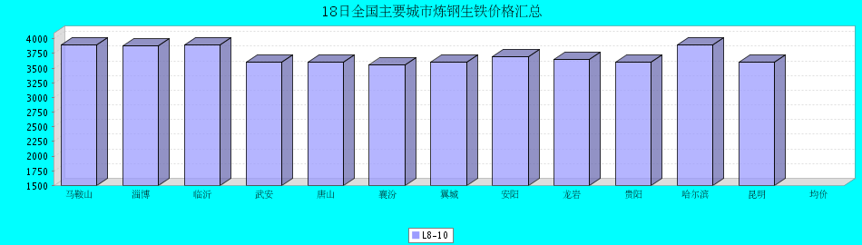 炼钢生铁马鞍山淄博临沂武安唐山襄汾翼城安阳龙岩贵阳哈尔滨昆明均价L8-10390038803900360036003550360037003650360039003600-涨跌----------50--40-产地安徽山东山东河北河北山西山西河南福…