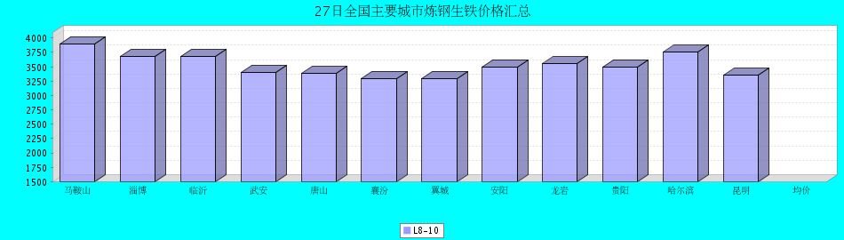 | 炼钢生铁 | 马鞍山 | 淄博 | 临沂 | 武安 | 唐山 | 襄汾 | 翼城 | 安阳 | 龙岩 | 贵阳 | 哈尔滨 | 昆明 | 均价 |