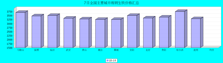 | 炼钢生铁 | 马鞍山 | 淄博 | 临沂 | 武安 | 唐山 | 襄汾 | 翼城 | 安阳 | 龙岩 | 贵阳 | 哈尔滨 | 昆明 | 均价 |