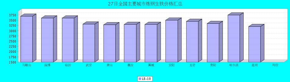 炼钢生铁马鞍山淄博临沂武安唐山襄汾翼城安阳龙岩贵阳哈尔滨昆明均价L8-10369036003600332032803300330035003450335037503200-涨跌----30-20--------产地安徽山东山东河北河北山西山西河南福…