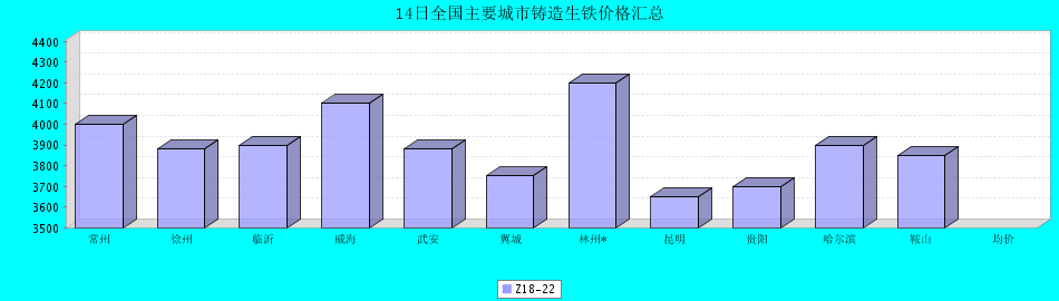 | 铸造生铁 | 常州 | 徐州 | 临沂 | 威海 | 武安 | 翼城 | 林州* | 昆明 | 贵阳 | 哈尔滨 | 鞍山 | 均价 |