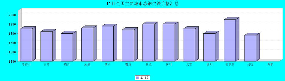 | 炼钢生铁 | 马鞍山 | 淄博 | 临沂 | 武安 | 唐山 | 襄汾 | 翼城 | 安阳 | 龙岩 | 贵阳 | 哈尔滨 | 昆明 | 均价 |