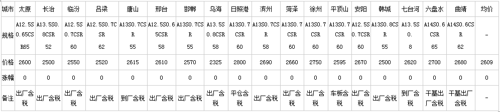 城市太原长治临汾吕梁唐山邢台邯郸乌海日照港滨州菏泽徐州平顶山安阳韩城七台河六盘水曲靖均价规格A12.5S0.65CSR65A13.5S0.8CSR52A12.5S0.7CSR60A12.5S0.7CSR62A13S0.7CSR55A12.5S0.65CSR58A…