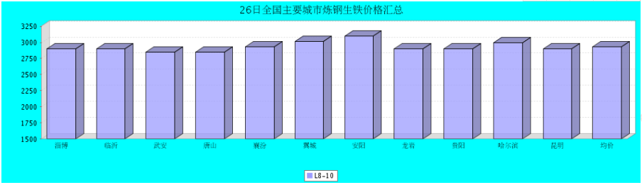 | 炼钢生铁 | 淄博 | 临沂 | 武安 | 唐山 | 襄汾 | 翼城 | 安阳 | 龙岩 | 贵阳 | 哈尔滨 | 昆明 | 均价 |