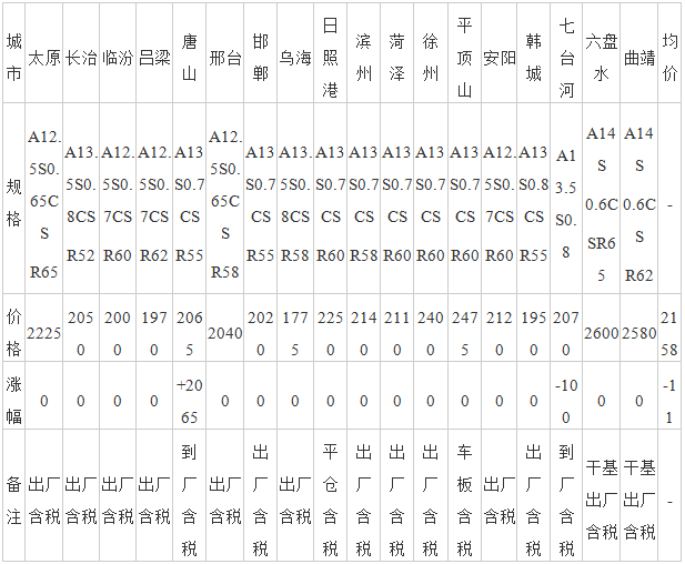 城市太原长治临汾吕梁唐山邢台邯郸乌海日照港滨州菏泽徐州平顶山安阳韩城七台河六盘水曲靖均价规格A12.5S0.65CSR65A13.5S0.8CSR52A12.5S0.7CSR60A12.5S0.7CSR62A13S0.7CSR55A12.5S0.65CSR58A…