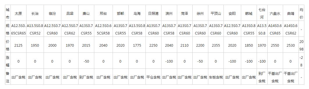 城市太原长治临汾吕梁唐山邢台邯郸乌海日照港滨州菏泽徐州平顶山安阳韩城七台河六盘水曲靖均价规格A12.5S0.65CSR65A13.5S0.8CSR52A12.5S0.7CSR60A12.5S0.7CSR62A13S0.7CSR55A12.5S0.65CSR58A…