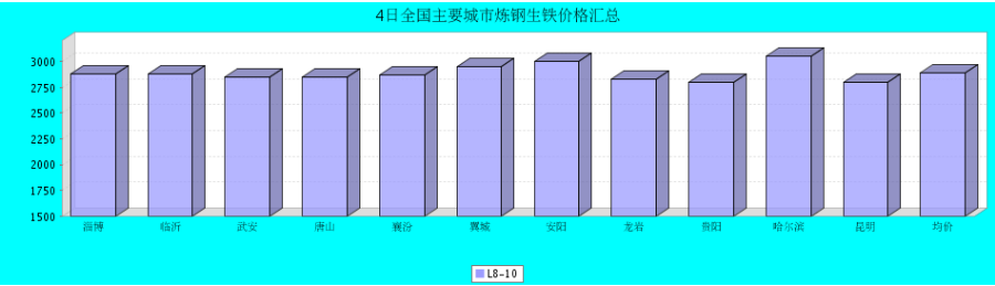 | 炼钢生铁 | 淄博 | 临沂 | 武安 | 唐山 | 襄汾 | 翼城 | 安阳 | 龙岩 | 贵阳 | 哈尔滨 | 昆明 | 均价 |