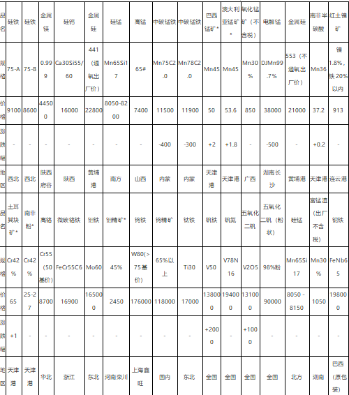 品名硅铁硅铁金属镁硅钙金属硅硅锰高锰中碳锰铁中碳锰铁巴西锰矿*澳大利亚锰矿*氧化锰矿(不含税)电解锰金属硅南非半碳酸红土镍矿规格75-A75-B0 999Ca30Si55 60441(通氧出厂价)Mn65Si17…