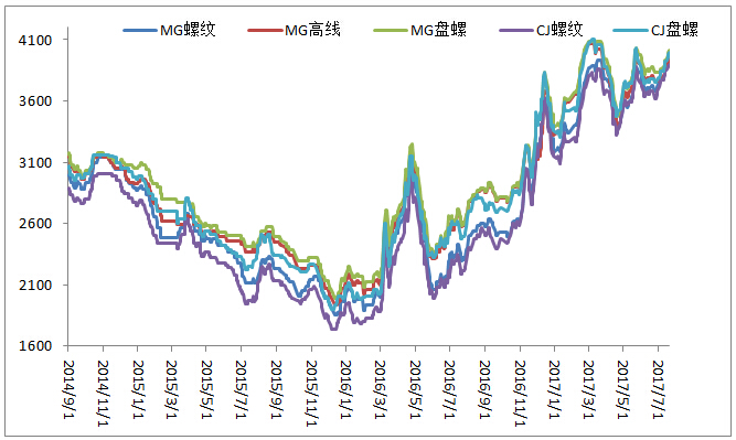 7月20日MG建材挂牌价格螺纹钢上调20元/吨,盘螺上调10元/吨,高线暂稳,现螺纹钢3960元/吨,盘螺4010元/吨,高线3950元/吨。MCJ安徽地区建材挂牌价格上调20元/吨,现螺纹钢3900元/吨,盘螺4000元/吨。价格跟踪图如下:
