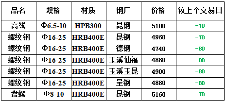 27日昆明市场建筑钢材价格下跌,具体如下: