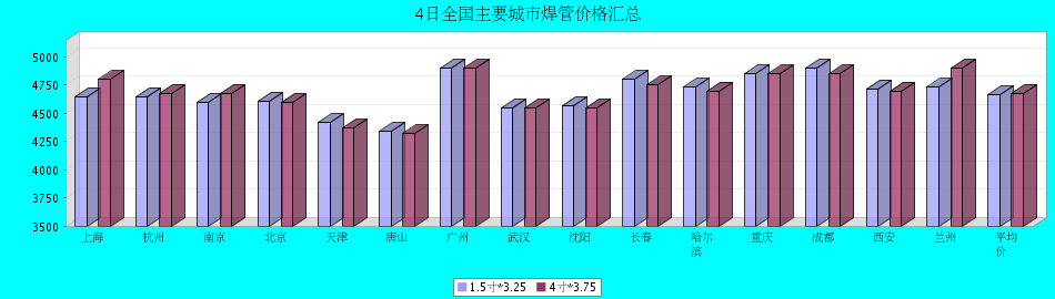 4寸*3.75焊管平均价格4680元/吨,与昨日相比下跌17元/吨,其中天津下跌20元/吨,兰州下跌50元/吨。