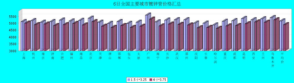 | 镀锌焊管 | 上海 | 杭州 | 南京 | 济南 | 合肥 | 福州 | 南昌 | 北京 | 天津 | 唐山 | 邯郸 | 包头 | 太原 | 广州 | 南宁 | 长沙 | 武汉 | 郑州 | 沈阳 | 长春 | 哈尔滨 | 重庆 | 成都 | 昆明 | 西安 | 兰州 | 乌鲁木齐 | 平均价 |