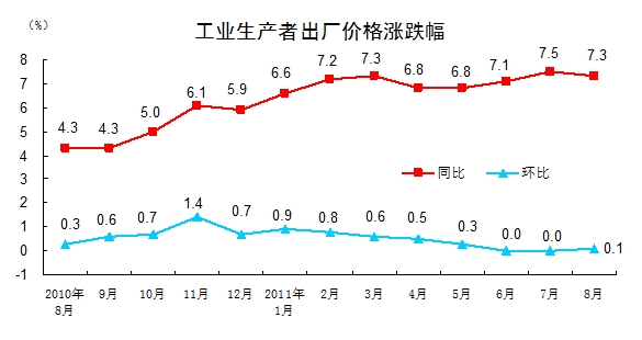 2011年8月份,全国工业生产者出厂价格比上月上涨0.1%,比去年同月上涨7.3%。工业生产者购进价格比上月上涨0.2%,比去年同月上涨10.6%。2011年1—8月,工业生产者出厂价格平均同比上涨7.1%,工业生产者购进价格平均同比上涨10.4%。