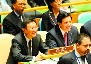 6月24日,世界金融和经济危机及其对发展影响高级别会议在纽约联合国总部开幕。图为中国外交部长杨洁篪(左)与中国常驻联合国代表张业遂出席会议。