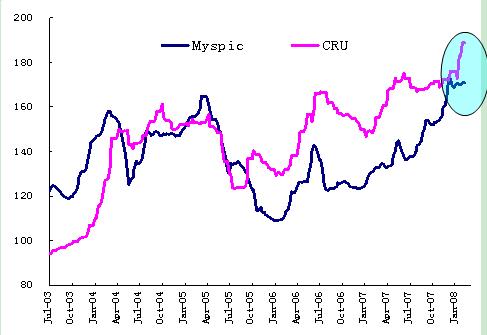 过去几年来,国际钢铁业呈现出了前所未有的景气局面。在日本,2007年在本国经济复苏,特别是制造业强劲增长的带动下,加上其独特的上下游供应链体系,日本市场钢铁产品供不应求,钢铁企业效益良好,甚至为保证国内市场的供应,新日铁和JFE还适当削减了其出口量。特别是今年2月份以来,随着钢铁原料成本的升高,欧美和日韩钢铁企业都已经开始把涨价成本向下游转移,国际钢材市场出现了明显上涨。(参考下图国际市场行情指数)。