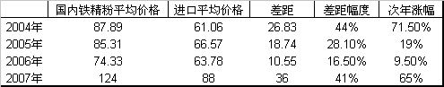 从表中可看出,进口矿石价格和国内矿石变化趋势具有一致性。从表4可以看出,当国内铁精粉全年平均价格高出进口平均价格15-30%时,次年度协议价格涨幅将在10—20%左右;当差距在40%以上时,涨幅却在60%以上。虽然这不能反映全部,但从上述数据可以看出,今年铁矿石年度协议价格涨65%基本遵循了与2005年度同样的规律。从市场化的角度看,这一谈判的结果并没有什么不妥之处,表明它仍然是一个双赢的结果。