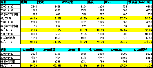 表2:今年1月12日与2007年1月12日原料和钢材价格对比