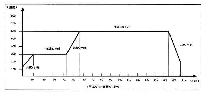 本高炉采用热风烘炉,重点烘烤炉底和炉缸,计划烘炉7天。烘炉的目的是缓慢驱赶高炉砌体内的结晶水,物理水,使耐火材料砌体均匀、缓慢而又充分膨胀,避免水分突然大量蒸发,产生爆裂和裂缝,从而导致耐火材料砌体损坏。避免在耐火材料内部产生热应力集中,或晶格转变导致砌体损坏,在一定程度上消除冷却设备的内应力。炼铁厂根据1号高炉所选用的耐火材料的特点,由生产技术科和高炉一车间共同制定了详细的烘炉方案和烘炉曲线。见下图:
