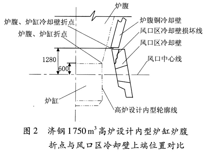 (1)结构原因。从炉体结构方面分析包含2个原因,一是损坏部位在风口大套以上。按照济钢1750m3高炉冷却壁布置分布,属于炉缸第4段冷却壁,甚至也可以称“风口区冷却壁”。该段冷却壁与第5段冷却壁(即炉腹冷却壁)对接处形成一个向炉内“凸”出的折点,由于向炉内“凸”出的量比较大,导致该部位砖衬相对较薄,即只有230mm(见图2)。由于砖衬较薄加上材质抗渣性能不好,因此,该区域砖衬不可能支撑较长时间。二是从高炉设计内型方面分析,其损坏部位属于炉腹区域,风口区(炉缸第4段冷却壁)冷却壁与炉腹冷却壁折点,比设计内型的炉缸与炉腹折点高出680mm,从设计内型上说明风口区冷却壁上端损坏部位是由于处于炉腹高温区所致。如果设计时能够将炉腹铜冷却壁向下延伸500 mm,风口区冷却壁损坏问题就很有可能不会发生,但那样会带来外部配管方面的麻烦。