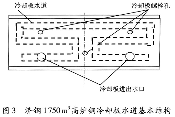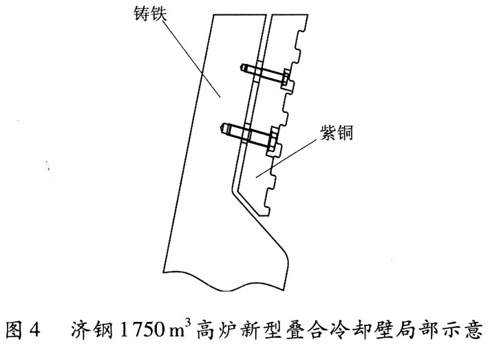 2007年3月,利用3号1750 m3高炉项修的机会,将风口区(第4段)冷却壁全部更换为新型叠合式冷却壁。