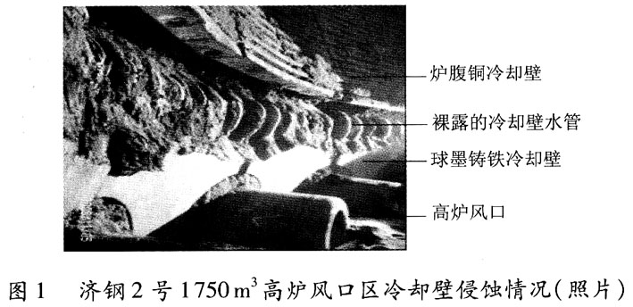 由于2号l 750 m3高炉存在风口区冷却壁漏水的重大隐患,已经计划2007年11月对其进行第2次项修,由于特殊原因临时改为1号1750m3高炉第2次项修。1号l750m3高炉停炉这次项修时,发现风口区冷却壁侵蚀也已经非常严重,其中上次项修新换上去的冷却壁也被侵蚀到与相邻冷却壁相同的程度。由此说明不改变该区域冷却壁结构形式和材质,难以满足高炉长寿要求。