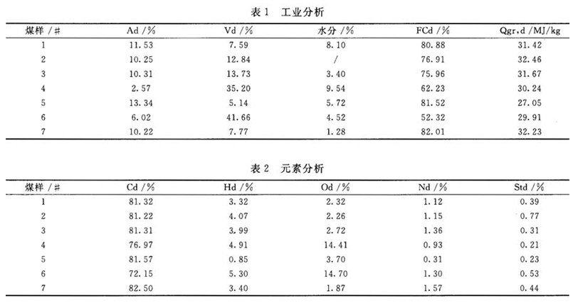 表1的工业分析结果显示,7种新煤种中,有4种烟煤[1](挥发分大于10%),分别为2#、3#、4#和6#,3种无烟煤,分别为1#、5#和7#。