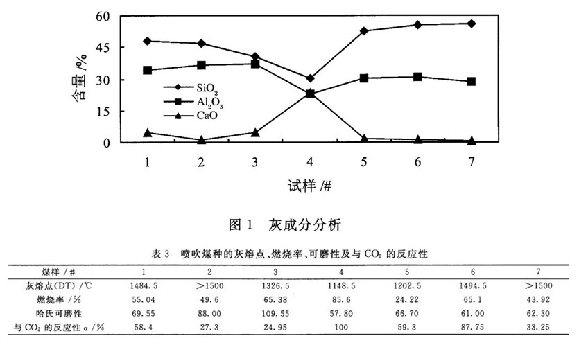 由图1可见,除4#煤外,其它煤灰成分中Al2O3的含量都较高,CaO含量偏低,即煤灰较“酸”。在配煤喷吹时可配入煤灰中碱性氧化物含量高的煤,以平衡喷吹用煤灰成分的酸碱比。由表3可以看出,6#煤变形温度较高,质量较好。4#煤的变形温度非常低,仅为1150℃,若单独作为喷吹煤使用,在喷枪前容易发生堵塞。5#煤的变形温度略高于1200℃,在喷吹时应该按其灰成分的全分析来考虑与国内其它的煤混合,可以适当提高灰熔点的温度。