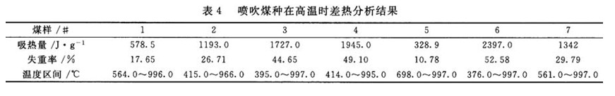 煤粉在高温下失重的试验是在高纯氩气保护的条件下进行的,以此来确定煤粉中的挥发分在高温析出需要的热量和失去的重量。在惰性气体中可以认为固定碳基本没有被燃烧。在高温(小于1000℃、并采用30℃/min的升温涑率,试验结果见表4。
