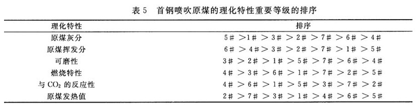 通过对新煤种各项性能指标综合比较,优先选择的煤种是1#、3#、4#和6#;其次为2#和7#;再次为5#。综合考虑性能指标与成本因素,选择2#煤进行了工业试验,制粉、喷吹正常,高炉顺行,证明2#煤可以作为首钢高炉喷吹煤配喷煤资源。