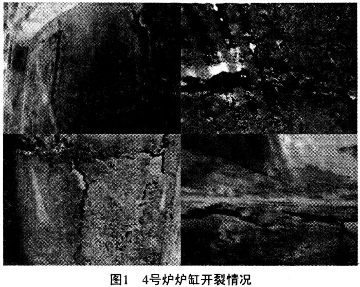 近年来,由于国内矿源缺口较大, 加之其它条件所迫, 致使南钢高炉大量吃地方矿,地方矿一大特点是铅含量高,2008年南钢炉料成分见表l,从表中数据可以看出吨铁铅的含量在0.78%左右,从而导致入炉铅负荷增加。4号炉出铁过程中,大沟铁水沟冒大量白烟,整个出铁场弥漫着呛人的气味,环境极差;在修补大沟和撇渣器的时候,发现在其底部有银白色的金属存在:开铁口的时候有银白色的液体在铁口渗出,铁口维护困难,来风早,理论铁量难以出干净;同时炉缸2层~5层在渣口大套方向炉壳多次出现开裂,裂纹长度最宽处达25mm,且由于炉壳开裂致使冷却壁管根出现拉裂断水、减流。裂纹产生后,裂纹处渗透煤气并富集,造成间断性煤气爆炸,使炉裂加剧,严重威胁炉缸安全,炉缸开裂情况见图l。综合分析4号炉出铁场环境差和炉裂均与铅的沉积富集有极大关系,因此决定强制炉底钻孔排铅。