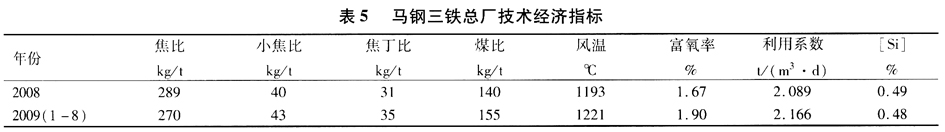 马钢2座4000m3高炉开炉已经2年多了,高炉由于多重因素的影响出现炉况失常。通过高炉长周期稳定顺行攻关,对关键操作参数进行预警干预,今年以来2座高炉保持了长周期稳定顺行,与2008年相比技术经济指标明显改善(见表5)。