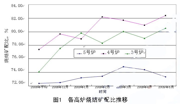 ⑴增产烧结矿增加高炉配料中烧结矿配比,从 2008 年 12 月开始将旧烧碱度由 1.7 下调到 1.65, 逐步增加 3 号高炉和 4 号高炉的烧结矿配比,减少球团矿配比,2009 年 2 月份开始增加 5 号高炉烧结矿配比,由于三烧生产的烧结矿转鼓强度与机速和产量之间的矛盾不好协调,三烧增产后转鼓强 度下降,三烧碱度维持 1.9 不变,5 号高炉烧结矿配比增加最少,各高炉烧结矿配比变化见图 1。