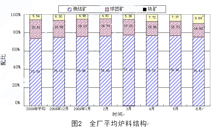 2008 年下半年以来,钢铁产品出厂价格和使用的原燃料价格比以往发生了较大幅度的变化,炼铁系统降低生产成本提升 EVA 成为生产组织的主流,许多降低铁水含硅量的措施与降成本提升 EVA 的方向是一致的,如增产烧结矿,多用烧结矿,少用球团矿,喷吹用煤多配烟煤,少配无烟煤。为确保各高炉不同生产条件下,实现长周期炉况稳定顺行和低硅低硫高温铁水冶炼,太钢进行了较长时间的探索,并取得了一定的阶段成效。