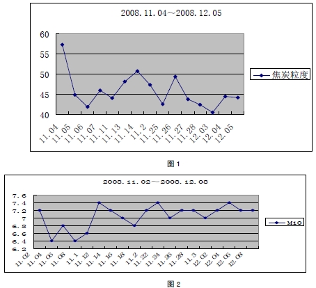 由于焦化厂干熄焦炉检修,1#高炉于 2008 年 12 月 1 日将使用一炼焦湿焦比例提到 100%,而 此前 1 号高炉焦炭中始终有 45%左右的干熄焦量。而自 2008 年 11 月焦炭粒度下降、M10 明显劣化见 图 1、图 2。