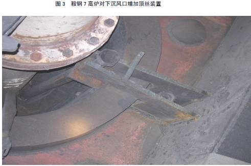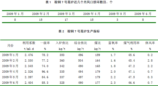 因此,在2009年5月份7高炉联合高炉点检作业区共同研究,增加风口顶丝装置,以便 固定风口位置,防止风口继续下沉,确保了高炉风口工作状态正常运行,这也就保证了风口能正常喷吹煤粉和高炉的正常生产,全月实现利用系数 2.397t∕m3.d,入炉焦比