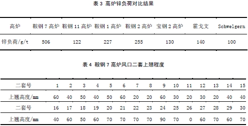 通过数据统计计算整理,各高炉目前锌负荷数据以及与国内其它高炉对比,数据见表 3。从 表中数据可以看出,目前7高炉的锌负荷超过技术标准